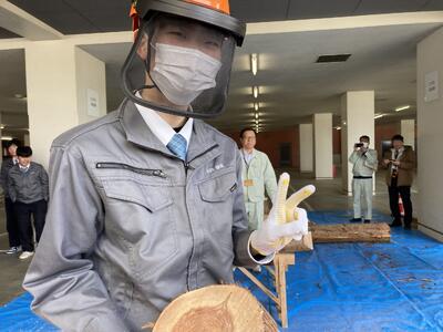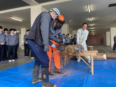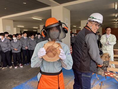 林業についての講義のあと、駐輪場で丸太切り体験を行いました。